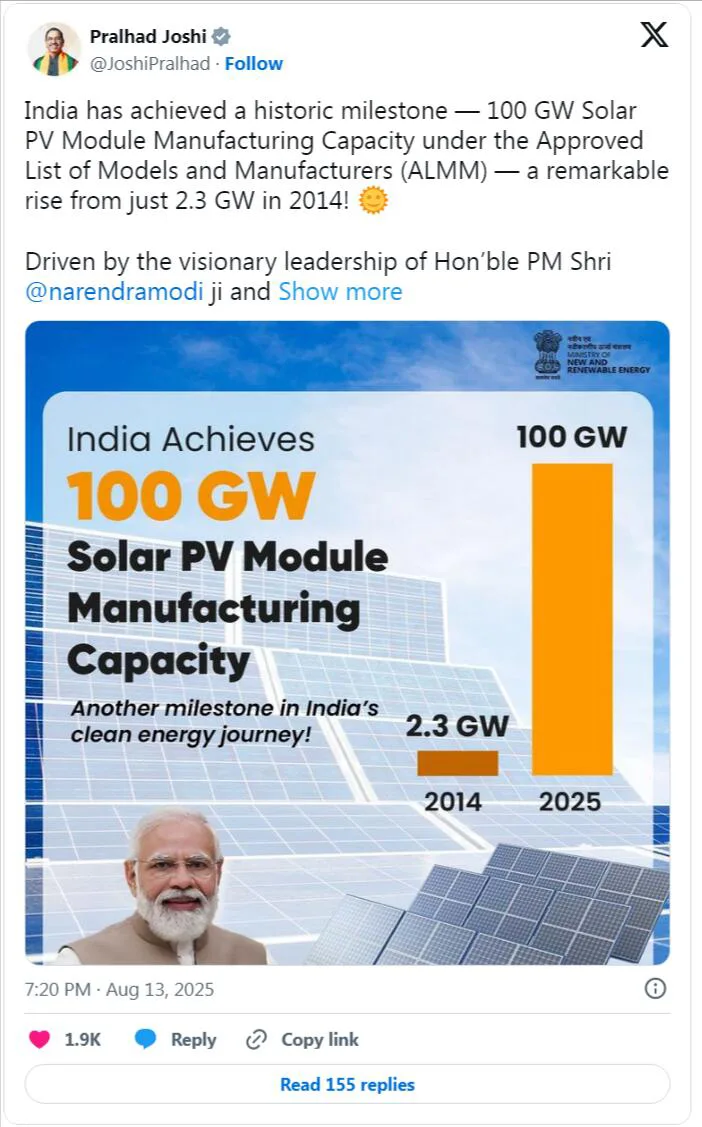 ຕົ້ນປີນີ້, ໃນເດືອນກຸມພາ 2025, ປະເທດອິນເດຍໄດ້ບັນລຸຈຸດສໍາຄັນຂອງຄວາມສາມາດຕິດຕັ້ງ 100 Gigavortaic, ເພີ່ມຂື້ນ 3450% ຈາກ 2.8 gigawatts ໃນປີ 2014.